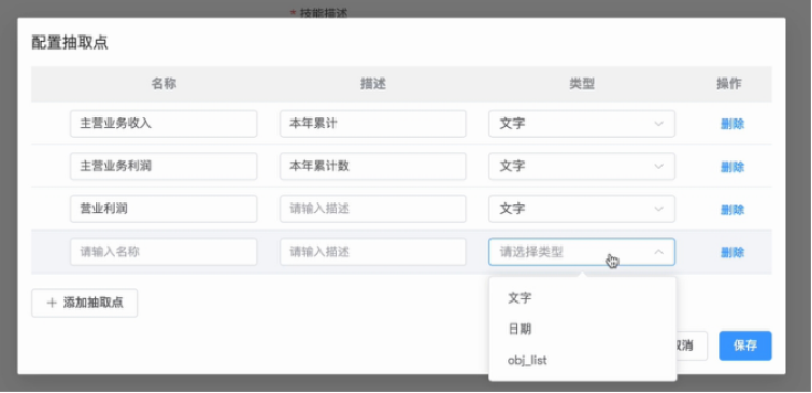 2. 配置抽取/審核要素:用戶在任務(wù)中添加抽取點(diǎn)/審核點(diǎn),并配置需要抽取/審核的要素。要素配置包括要素名稱、描述、類型等詳細(xì)信息,用戶可以根據(jù)實(shí)際需求靈活設(shè)置。