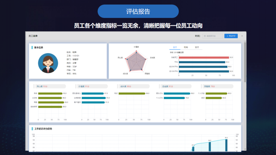 個人評估報告:展示個人工作狀態評分、趨勢、畫像數據,幫助管理者了解員工工作狀態和成長潛力。