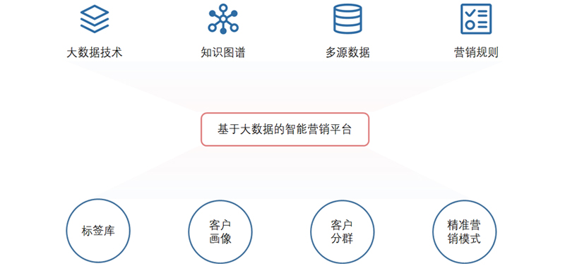智能營銷平臺依托大數據、分析應用和知識圖譜模型,將多源客戶數據集成,并進行自然語言標簽化處理,從而構建客戶標簽庫、客戶畫像、客戶分群及營銷規則。在此基礎之上,同時建立標簽與營銷管理平臺互動支撐的營銷全流程管理,協助銀行金融機構實現以數據驅動的精準營銷模式。